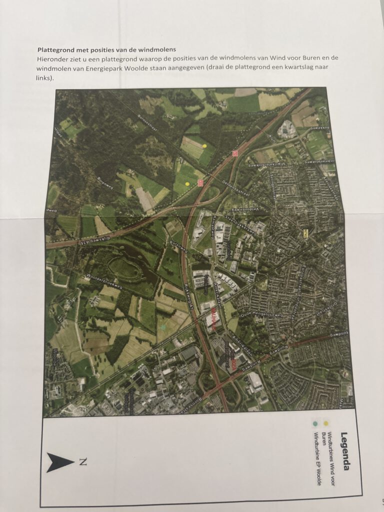 voor Buren en de windmolen van Energiepark Woolde staan aangegeven.